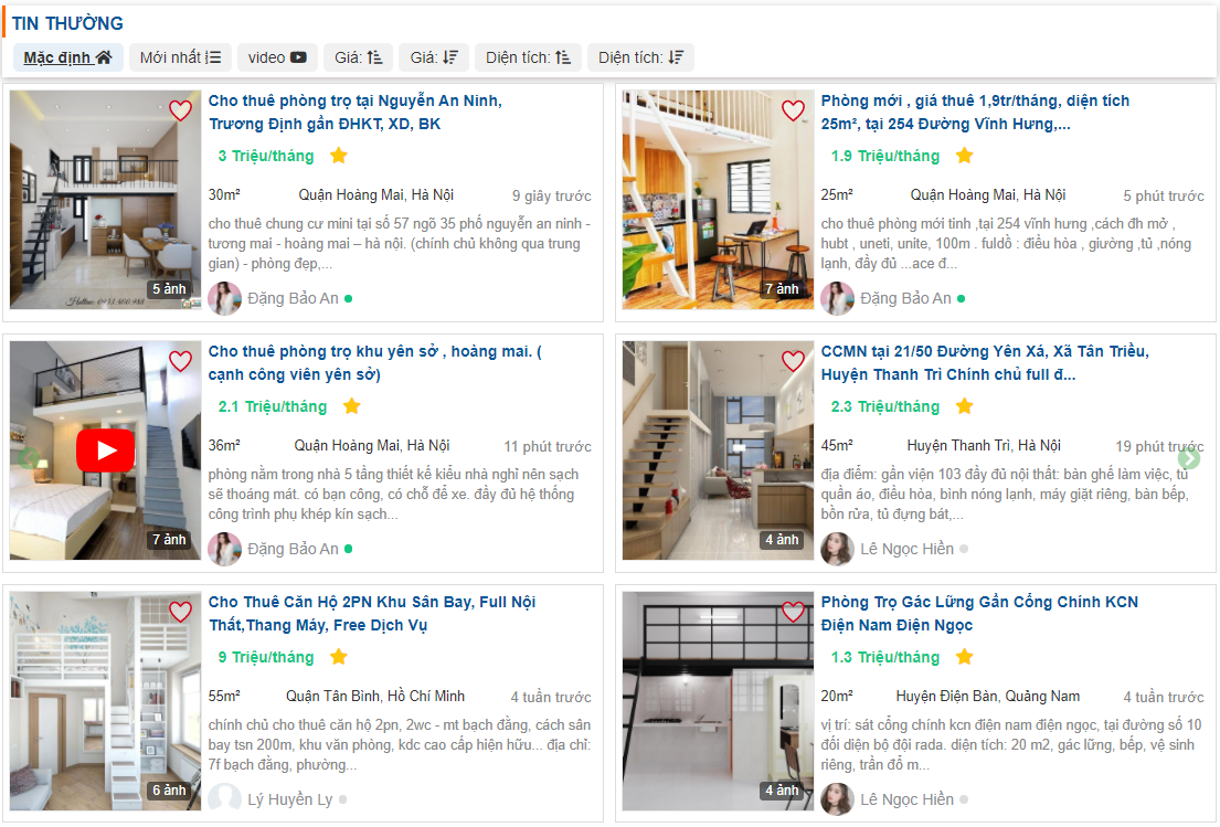 - Tin thường: Là loại tin đăng bằng chữ màu xanh và luôn nằm dưới các Tin Vip và Tin Hot